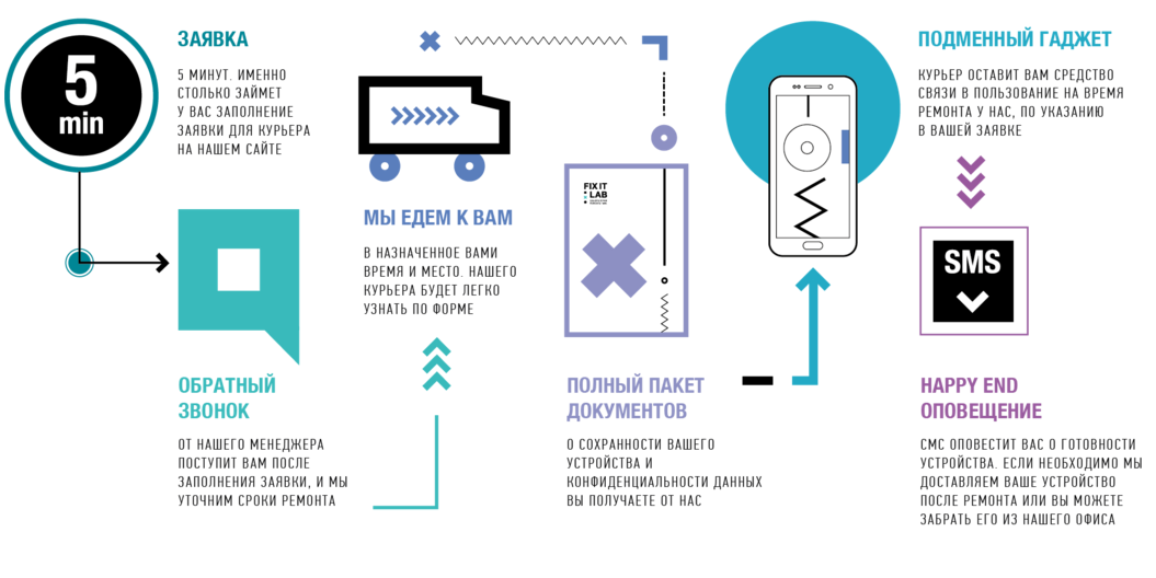 Для того, чтобы заказать ремонт гаджета, не обязательно приходить в центр - оформить заказ можно на мастерской. За сломанным девайсом приедет курьер, он же, если надо, привезет починенную вещь обратно. Более того, если вы отдали в ремонт телефон, курьер оставит вам другой. Как только все будет готово, вам отправят sms.